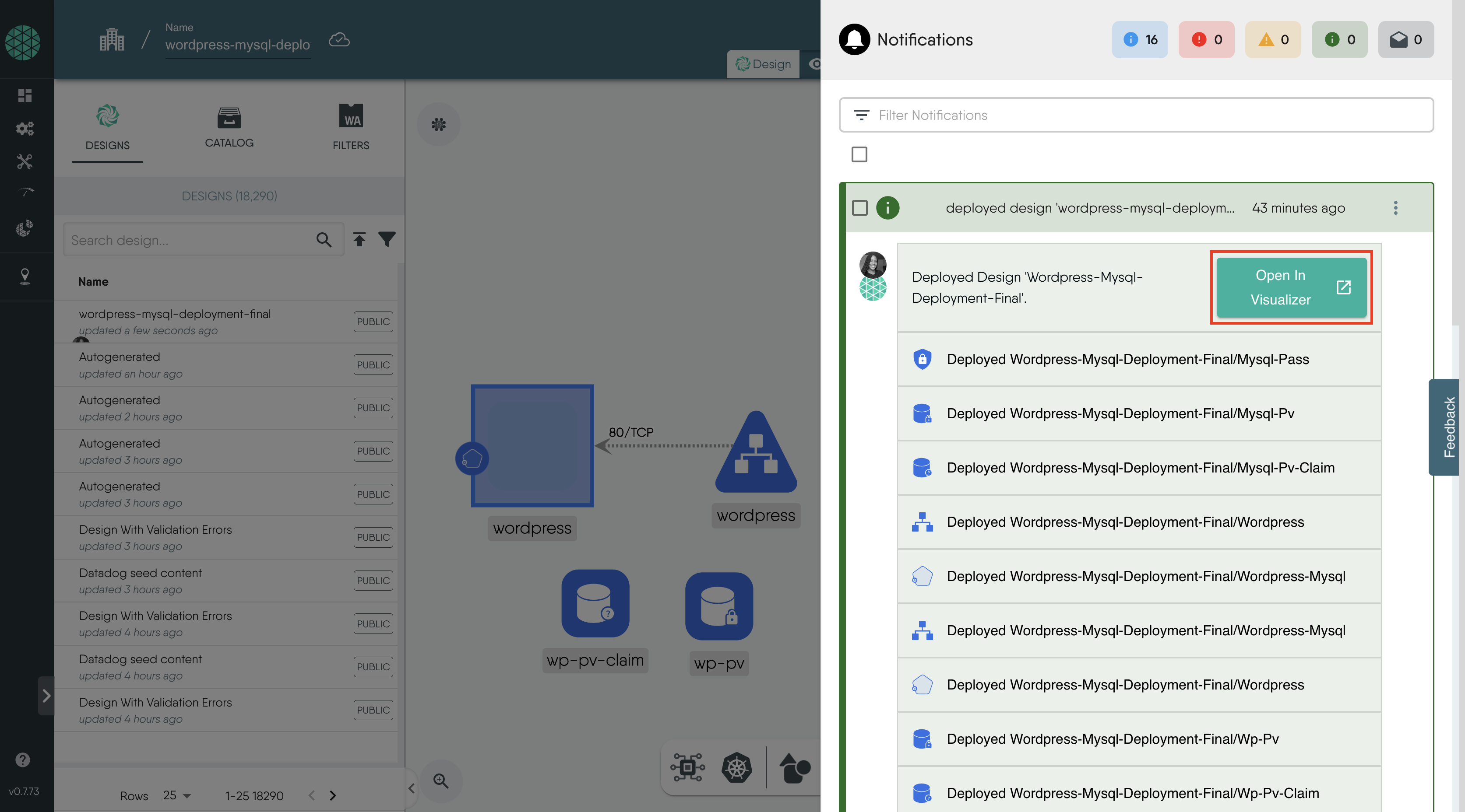1. To check the status of your deployment, click on the notification icon on the top right corner. You can click on Open In visualizer to navigate to the Visualize section or follow the steps below.