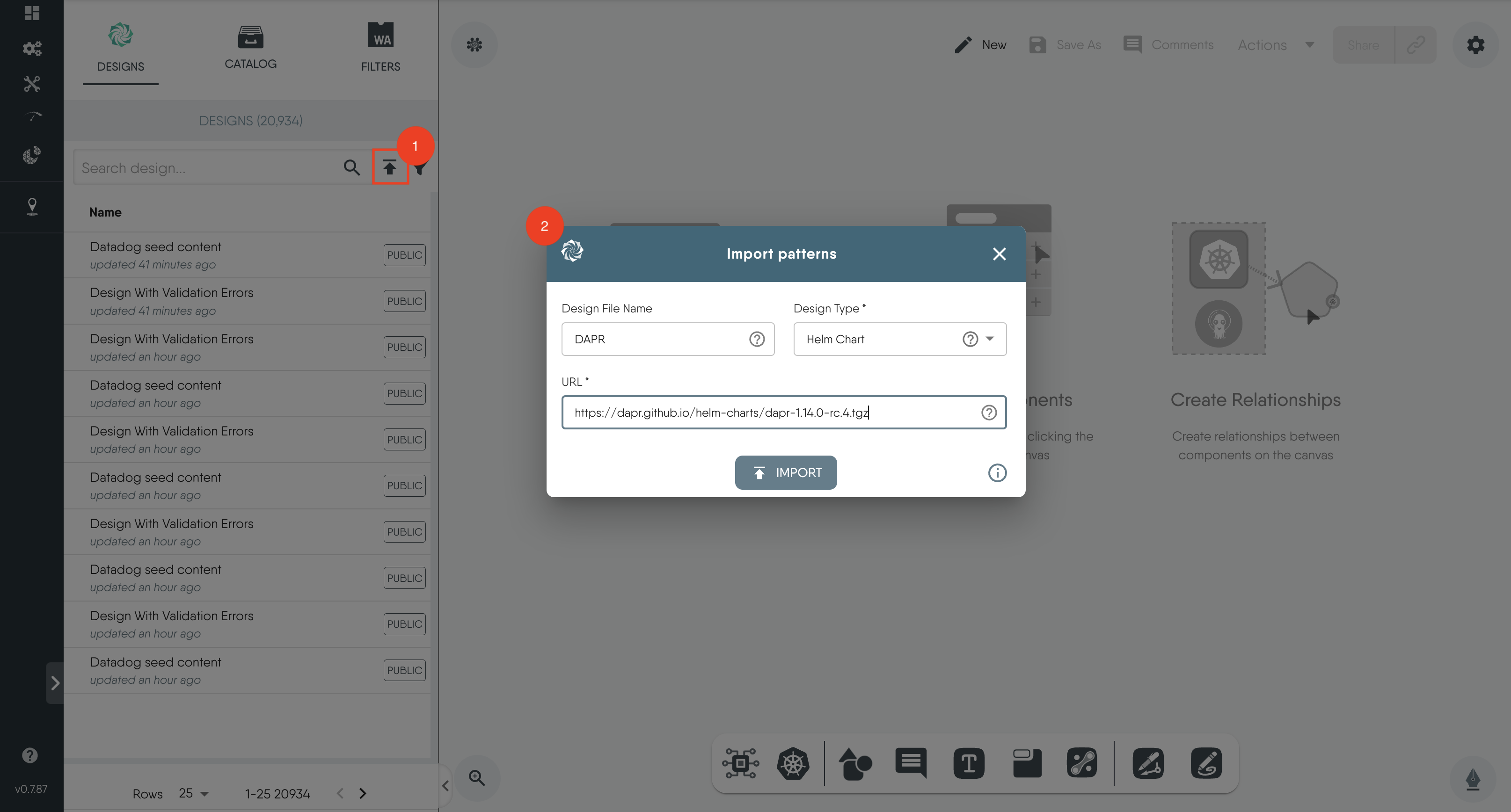On the Designs tab on the left, click on the DAPR design you just imported. This will display the various Kubernetes resource components required for deploying the Dapr control plane on the canvas.