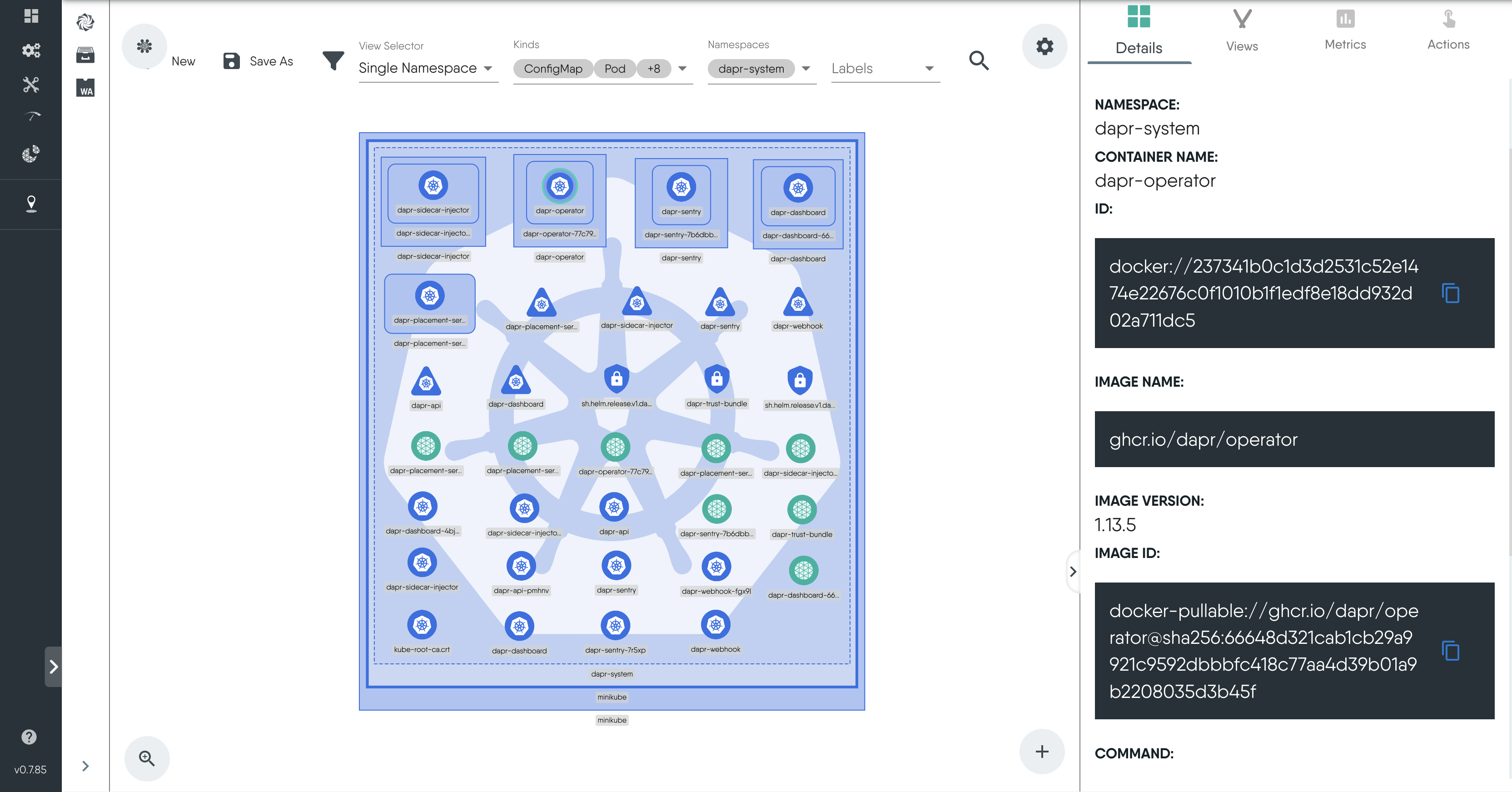 To briefly take a look at one of these network relationships, click on the dapr-operator container in the deployment and its service to open their configuration tabs.