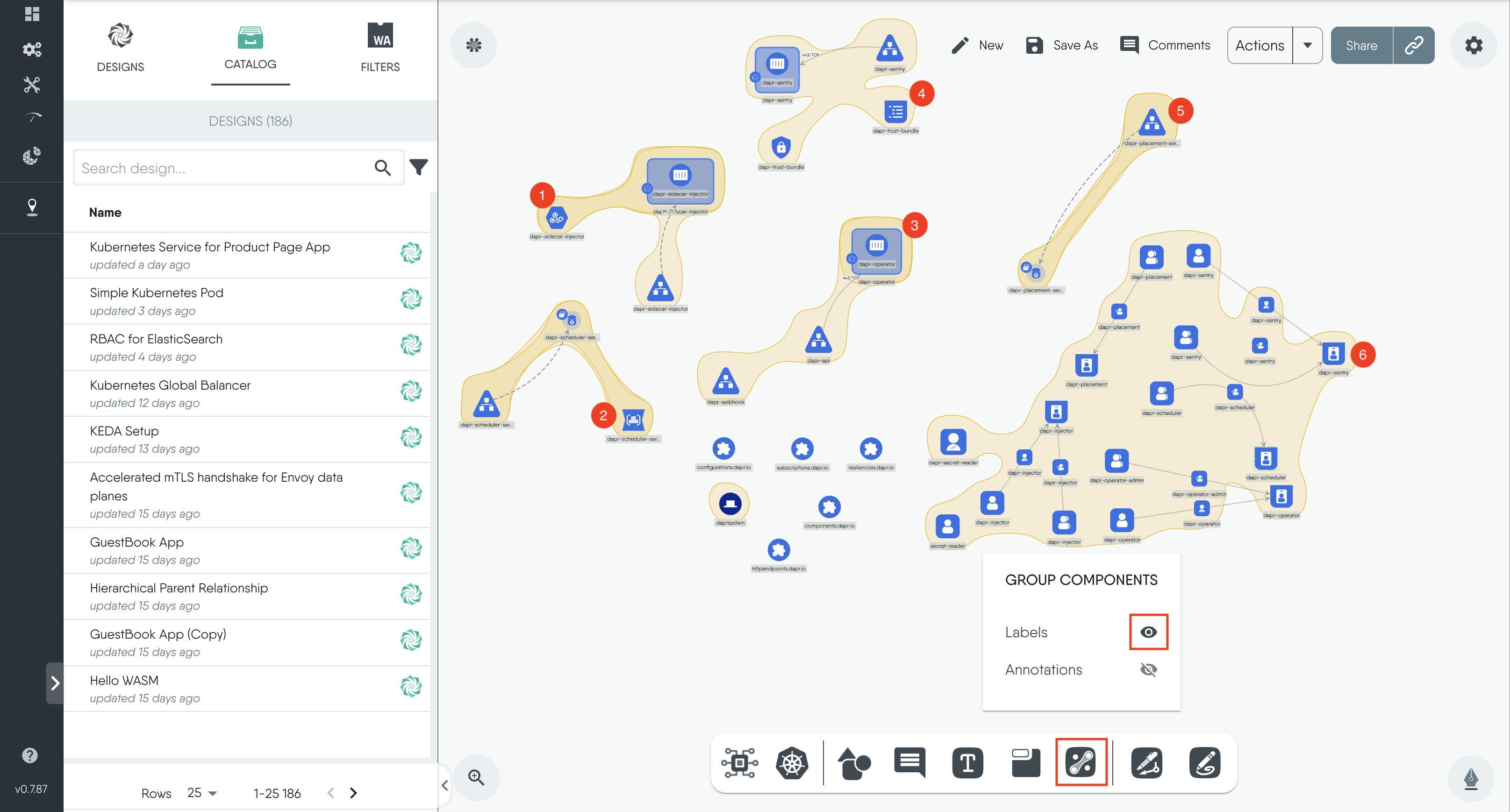 Click on the Group Components icon on the dock at the bottom of the canvas to group resources based on shared labels or annotations.