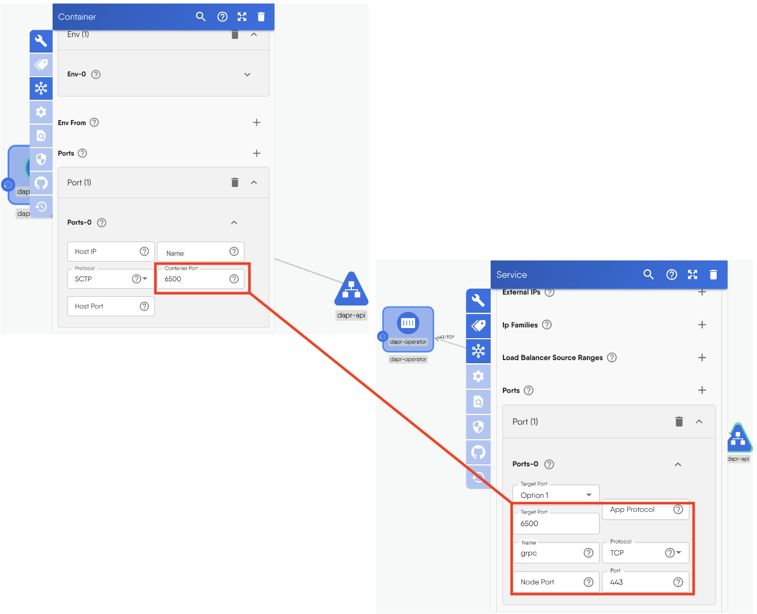 From the diagram above, the container within the dapr-operator deployment is configured to expose Container port 6500. The dapr-api service listens on port 443 and forwards incoming traffic to Target Port 6500. This is why the arrow is labeled with 443/TCP.